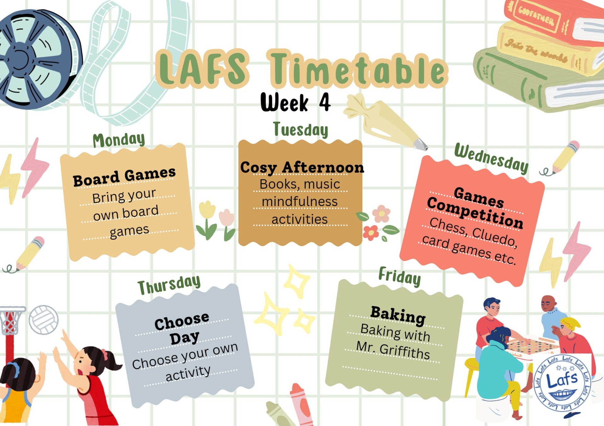 Please see the four week rolling schedule for activities that take place in LAFS. We are on Week 3 this …